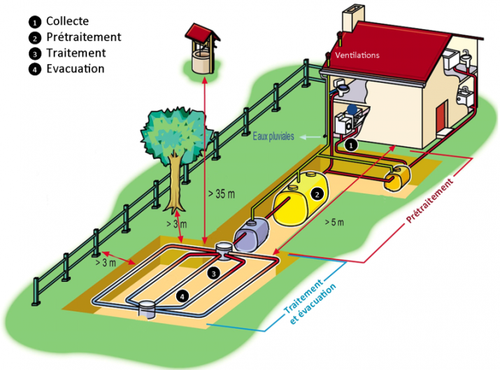 L'assainissement non collectif représente tout système d’assainissement effectuant la collecte, le prétraitement, le traitement et l’évacuation des eaux usées domestiques, des habitations non raccordées au réseau public d’assainissement.